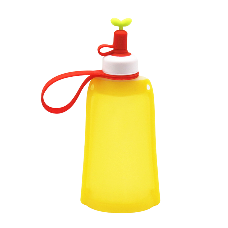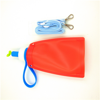 This foldable water bottle is made of silicone and designed for kids. Lightweight and easy to carry, it includes a shoulder strap and is available in fun colors. Your company logo can be added.