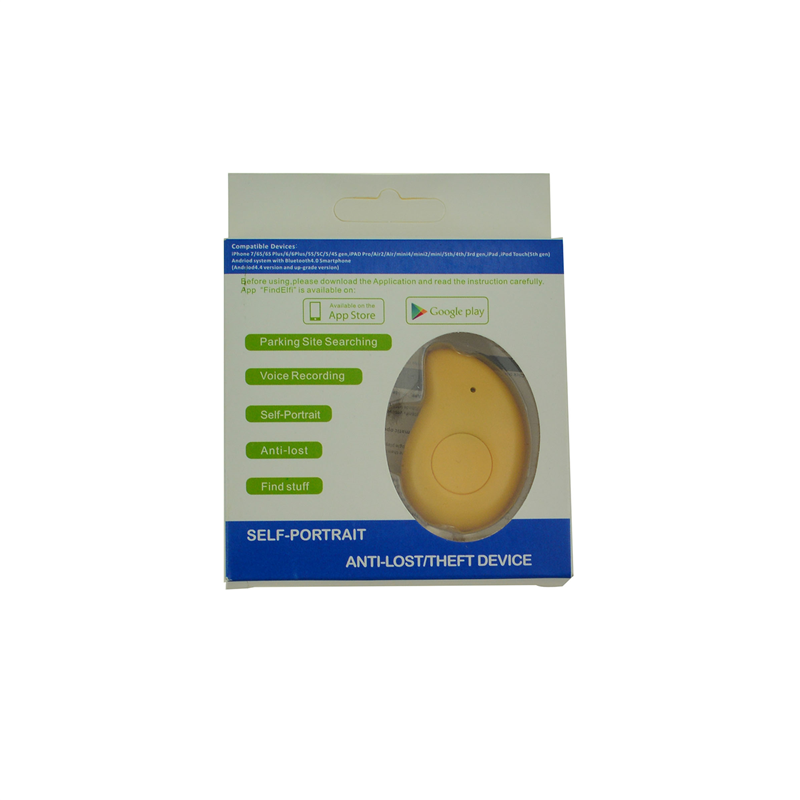 Mango Shaped Bluetooth Key Finder is made of ABS. Connects via Bluetooth for two-way search. Alerts when out of range, shows last location on map, supports silent mode with timeline, selfie remote, and voice recording control. Anti-loss alarm activates when disconnected.