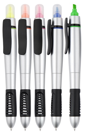 This sleek silver pen combines a ballpoint and highlighter, perfect for multitasking. It features a comfortable grip and writes in black or blue ink. Made of eco-friendly ABS. Great for offices, schools, or giveaways. Custom logo printing available.