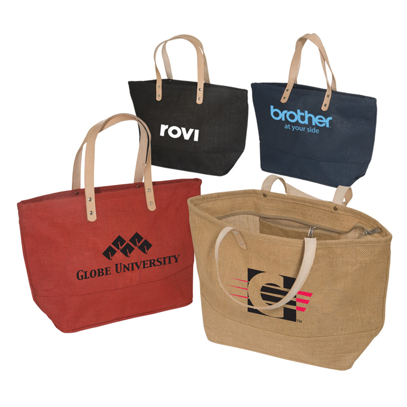 Made of laminated jute with leather handles and a zipper closure. Includes inner zip pocket. Durable for grocery shopping or daily use. Company logo can be imprinted.