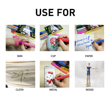 Set of 12 acrylic paint markers with vibrant opaque ink. Works on paper, canvas, wood, glass, plastic, fabric, and more. Logo customizable on pen body.