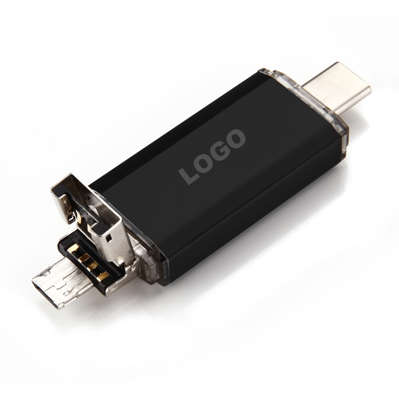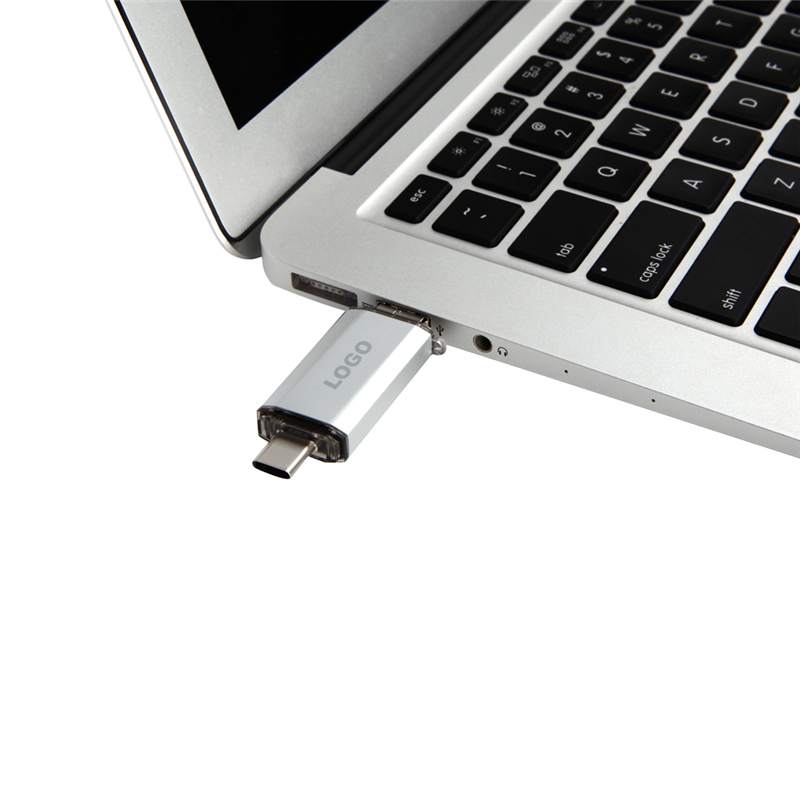 This 32GB USB flash drive features both Type-C and USB 2.0 ports, offering quick data transfer and wide device compatibility. Made of aluminum, it's waterproof and shock-resistant.