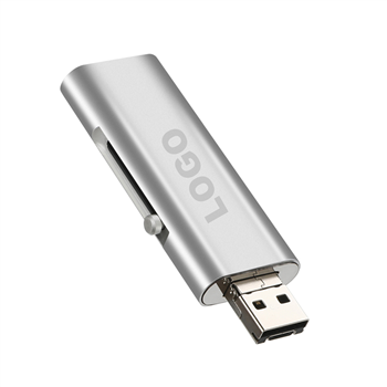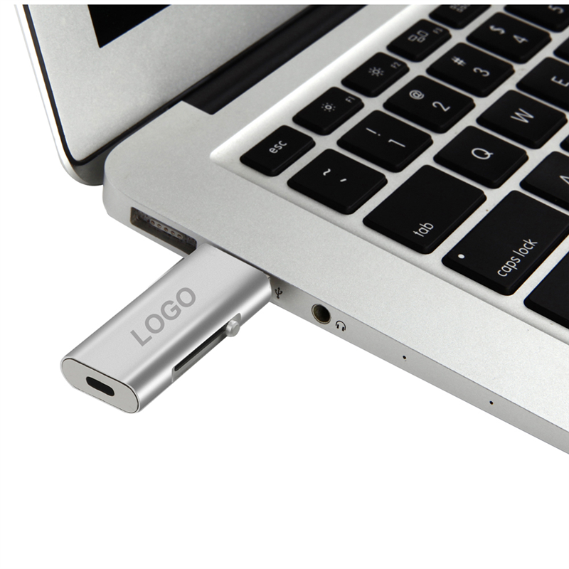 32G USB flash drive with Type-C, Micro-USB, and USB 2.0 ports. Water-resistant chip and durable aluminum casing. Great gift to show your brand.