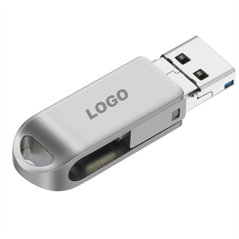 64G USB drive with 3.0 USB, Type-C, and Micro-USB ports. Water-resistant chip and metal body make it a durable gift to show your brand.