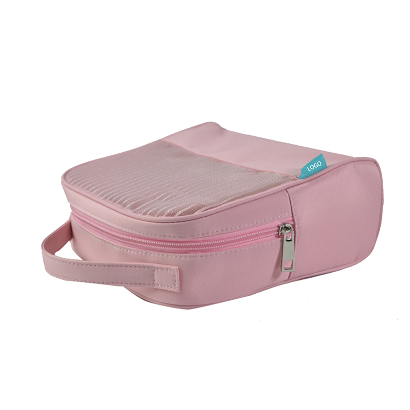 A stylish cosmetic bag with handle, made of pink and white mesh and patent leather. Perfect for travel, gifts, or personal use.