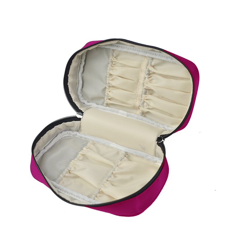 Made of satin and polyester. This compact cosmetic bag is perfect for travel.