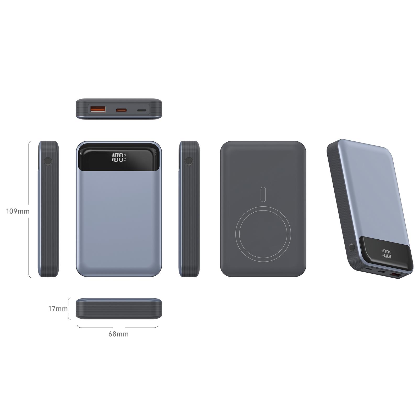 This 10000mAh charger supports 20W wired and 15W wireless fast charging. Its magnetic suction design ensures stable wireless performance. LED screen shows power level clearly. Ideal for daily, travel, or office use. Logo can be imprinted on the surface.