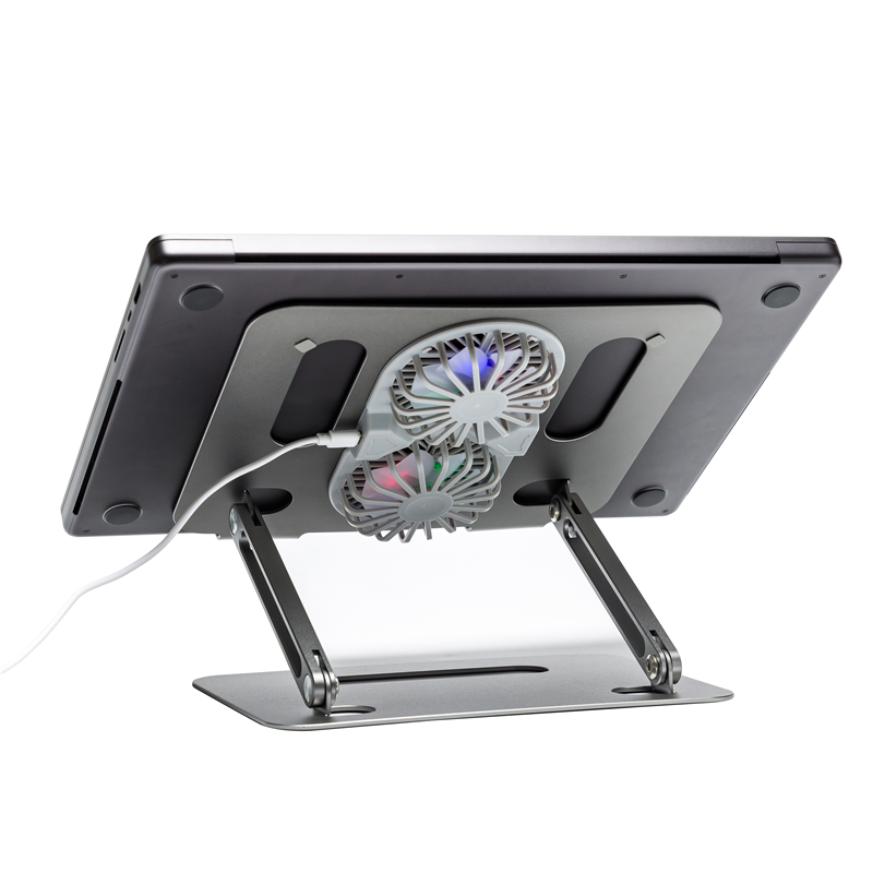 This foldable aluminum laptop stand is designed to enhance airflow with built-in cooling fans, helping prevent overheating during long hours of use. It’s adjustable, portable, and ideal for work or travel.