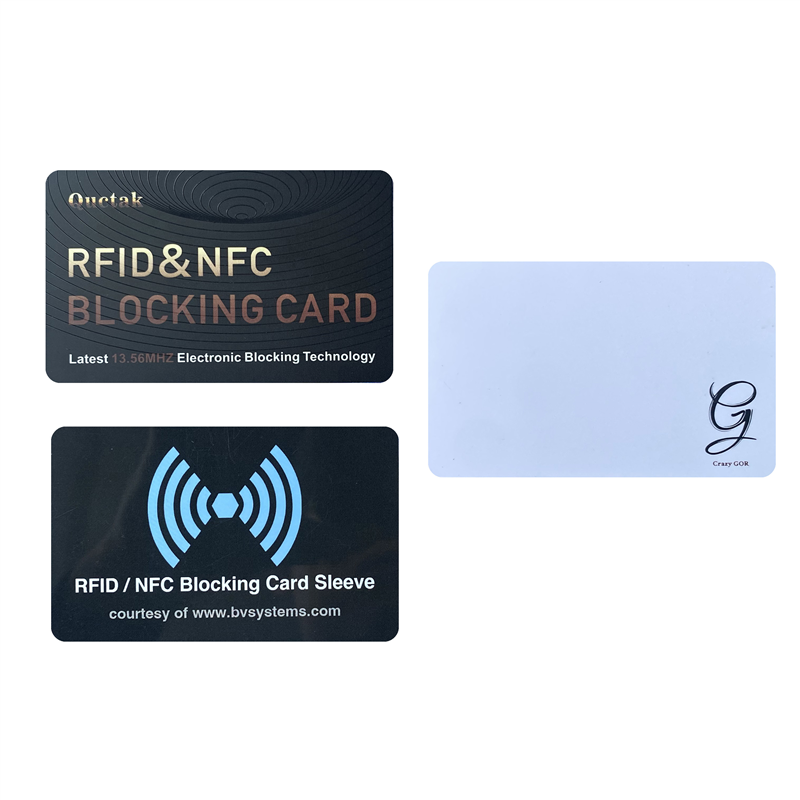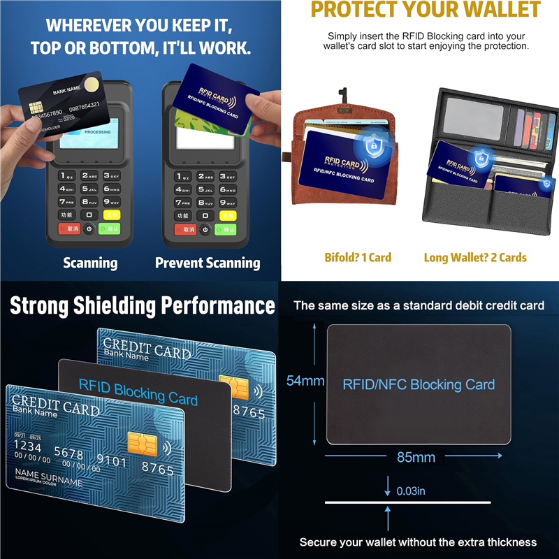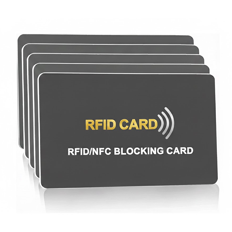 This RFID blocking card is made of layered technology with a built-in antenna and jammer chip. It draws power from incoming radio waves to emit a jamming signal, helping protect credit cards and IDs from wireless theft. Ideal for contactless security.