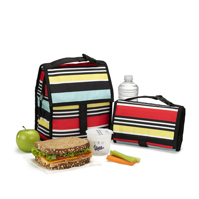 Made of 600D polyester with PEVA foil lining, this stylish striped lunch bag is waterproof and insulated to keep food hot or cold. Great for work, school, or travel.