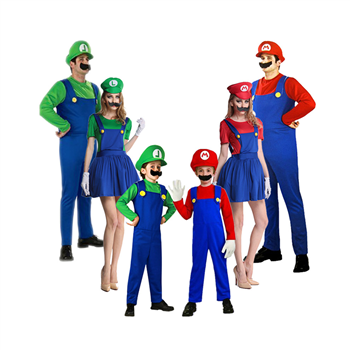 Children’s size cosplay set includes a hat, mustache, and jumpsuit. Perfect for Halloween, parties, or themed events.