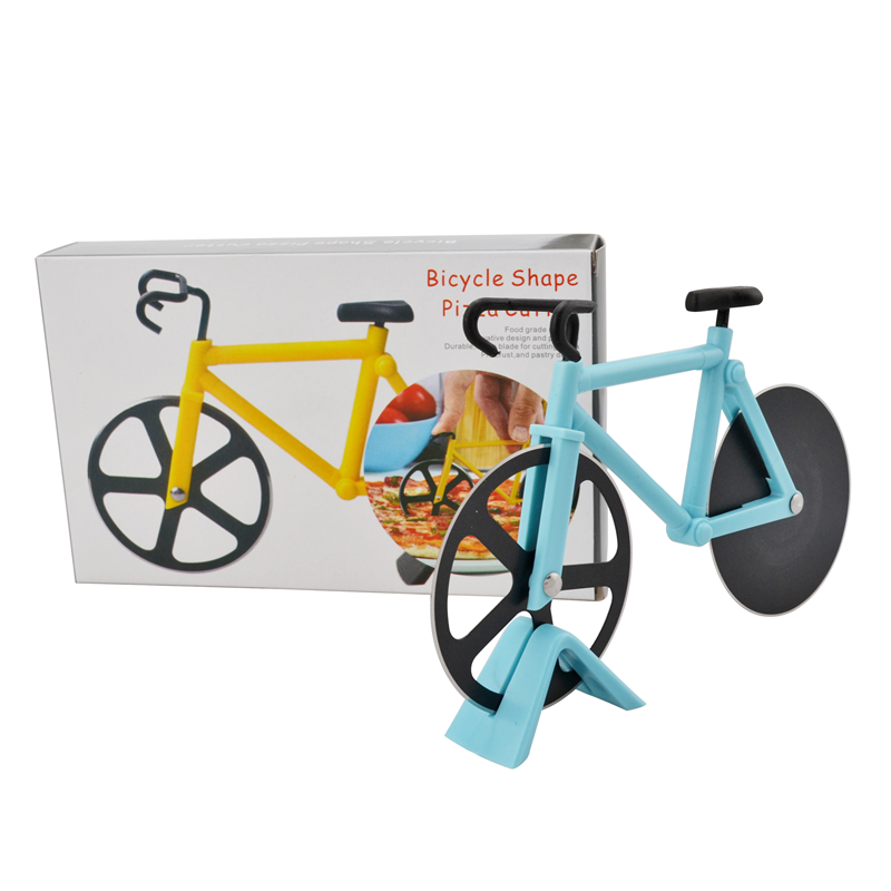 Shaped like a bicycle, this fun pizza cutter features dual non-stick stainless steel blades for smooth slicing and easy cleaning. Includes a display stand and can be customized with your logo.