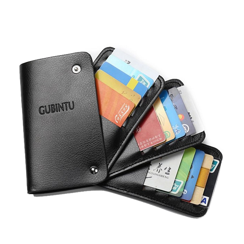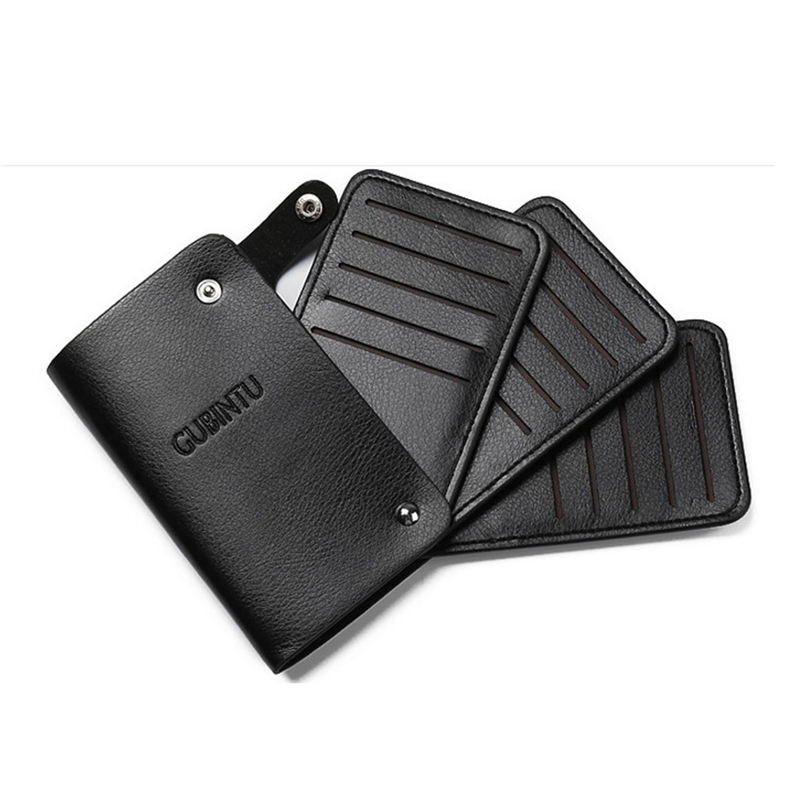 Made of high-quality PU, this card holder features a snap closure and rotating slots to keep contents secure and accessible. Great for travel or everyday use.