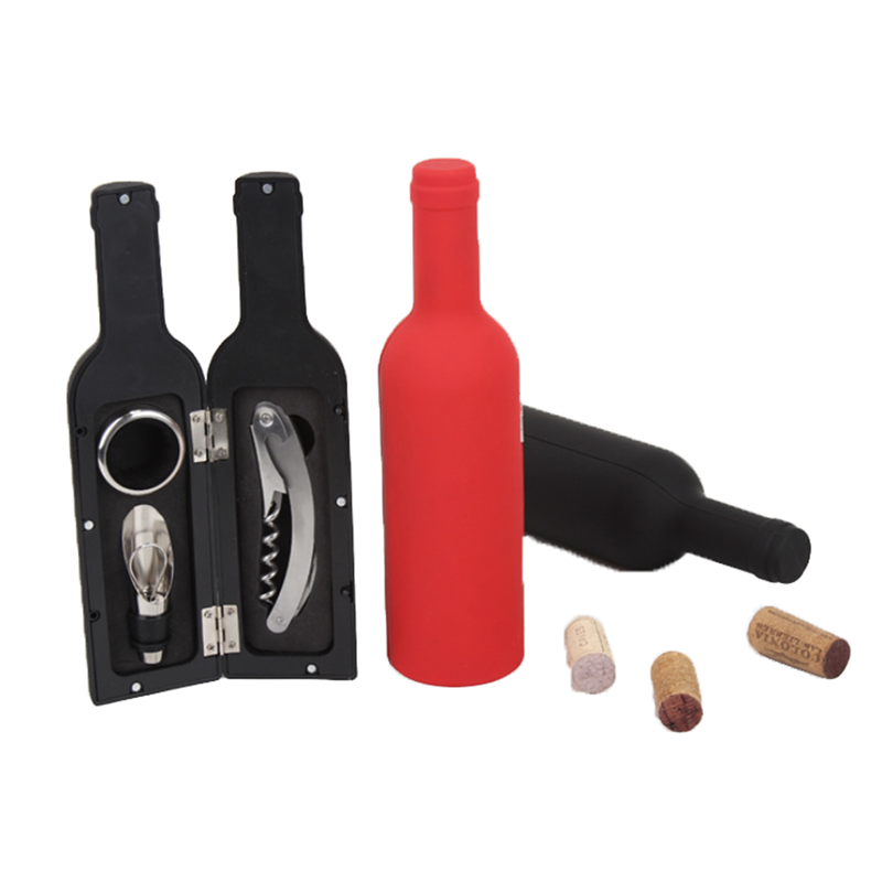 This wine tool set includes a corkscrew, drip stop ring, and combo pourer stopper, all housed in a bottle-shaped ABS case. A stylish gift for wine lovers.