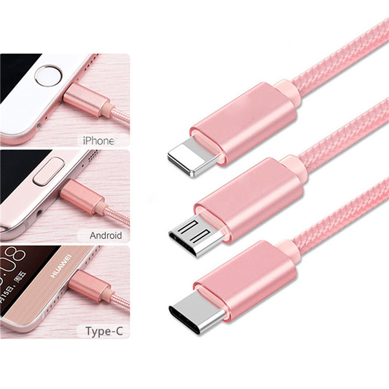 This 3-in-1 charging cable is made of durable nylon and copper. It features lightning, type-C, and micro-USB connectors to support most mobile devices. Includes an attachable band for easy storage.