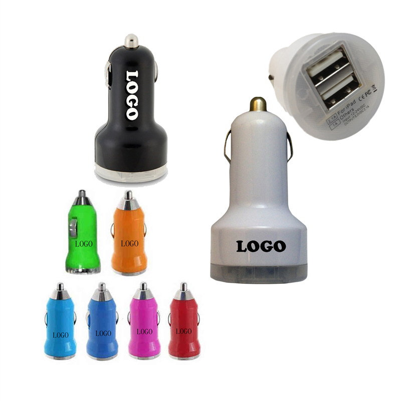 This compact ABS car charger features two USB ports for charging multiple devices. Compatible with most phones and tablets via USB cables through a vehicle's cigarette lighter.