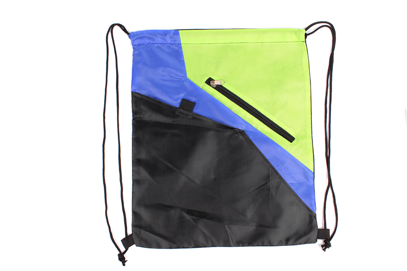 Made of 210D polyester, this three-tone drawstring backpack includes a large main compartment, front zipper pocket, and additional front mesh pocket for a water bottle—ideal for gyms, events, or travel.