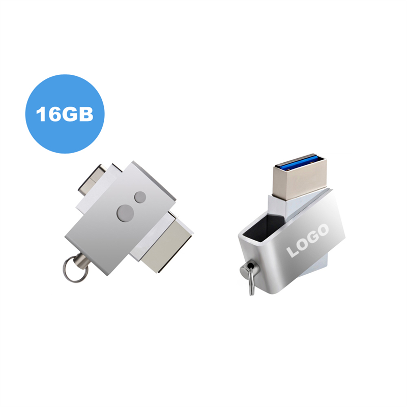This dual-port flash drive features USB 3.0 and Type-C connectors for fast data transfer. Made of zinc alloy and aluminum, it includes a waterproof, shockproof UDP chip. Its rotatable and retractable design offers durability and easy use.