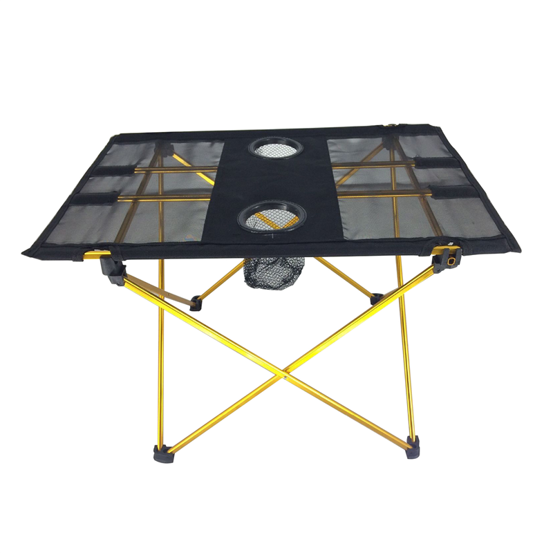 Made of aluminum alloy tube and mesh polyester, this foldable table includes 2 built-in cup holders. Lightweight yet sturdy, holds up to 50 lbs.