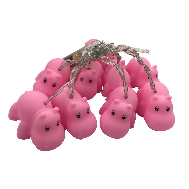 This vinyl LED string light includes 10 pink hippo-shaped lights. Runs on 2 AA batteries (not included) and is neatly packed in a PVC box.