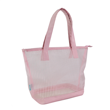 A fashionable tote made from pink mesh and patent leather. Spacious and stylish—great for shopping, daily use, or promotions.