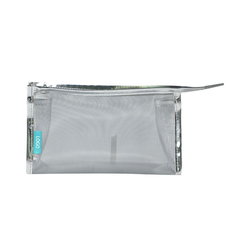 Made of patent leather and mesh. A sleek and modern cosmetic bag—great for beauty giveaways or travel use.