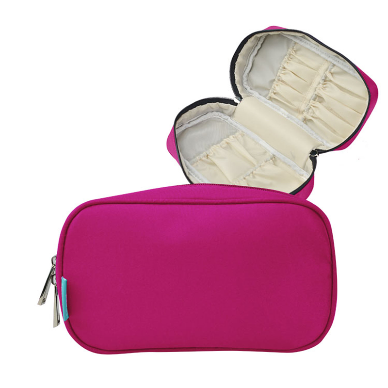 Made of satin and polyester. This compact cosmetic bag is perfect for travel.