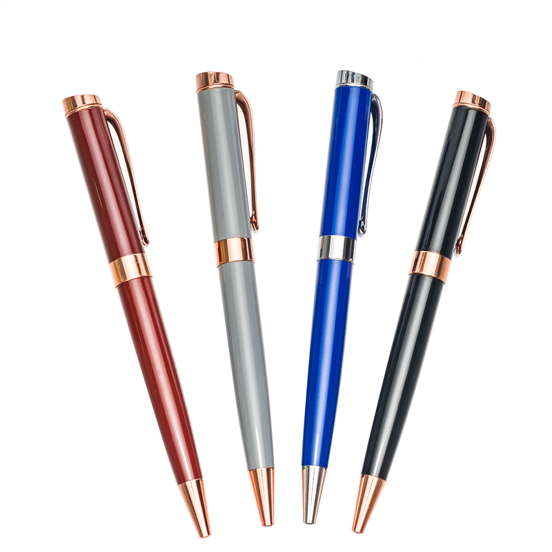 A classic twist ballpoint pen with a smooth metallic finish and elegant rose gold or chrome trim. A premium pick for business gifts and promotional use.