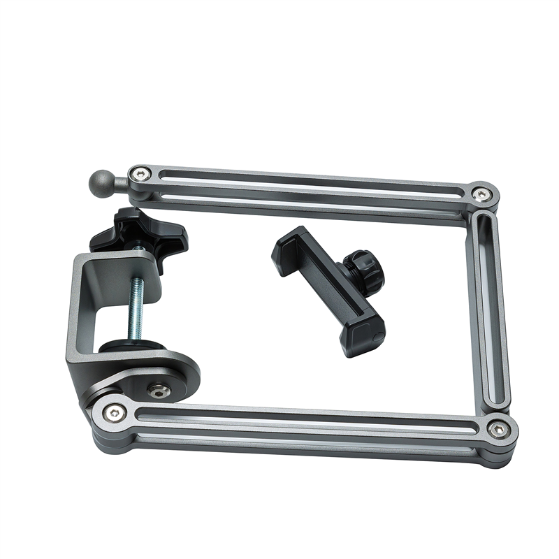 This clamp-on aluminum phone holder features a fully adjustable arm for versatile positioning. Easily mounts to desks or tables, making it ideal for video calls, recording, or multitasking hands-free.