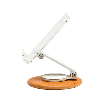 This compact phone stand features a clear acrylic holder and a natural wood base. The adjustable metal arm allows for stable support and flexible viewing angles. Perfect for home, office, or promotional use.